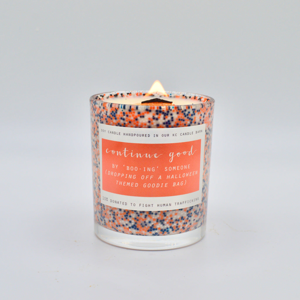 D E T A I L S : | NOTES OF PUMPKIN SPICE, SMOKE, BUTTER CREAM, VANILLA, NUTMEG, & CLOVE / BACK CANDLE READS CONTINUE GOOD BY 'BOO-ING' SOMEONE (DROPPING OFF A HALLOWEEN THEMED GOODIE BAG) |