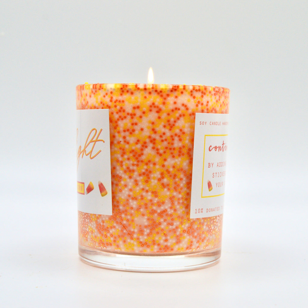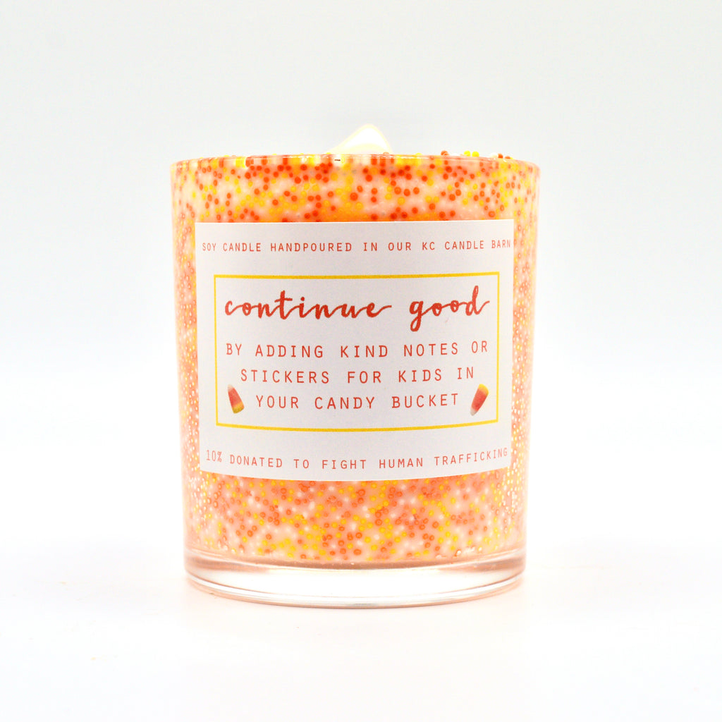 We hope you love this playful yet aesthetically pleasing festive Fall candle. :) It is officially Fall and this candle most definitely agrees with so many fall scents combining together. Sea salt and vanilla mixed with honey butter, pecan, & spices! Calvin and I got this scent as a sample and loved it so much that we decided we must make it a new Fall scent! The back of this candle says 'continue good by adding kind notes or stickers for kids in your candy bucket'.
