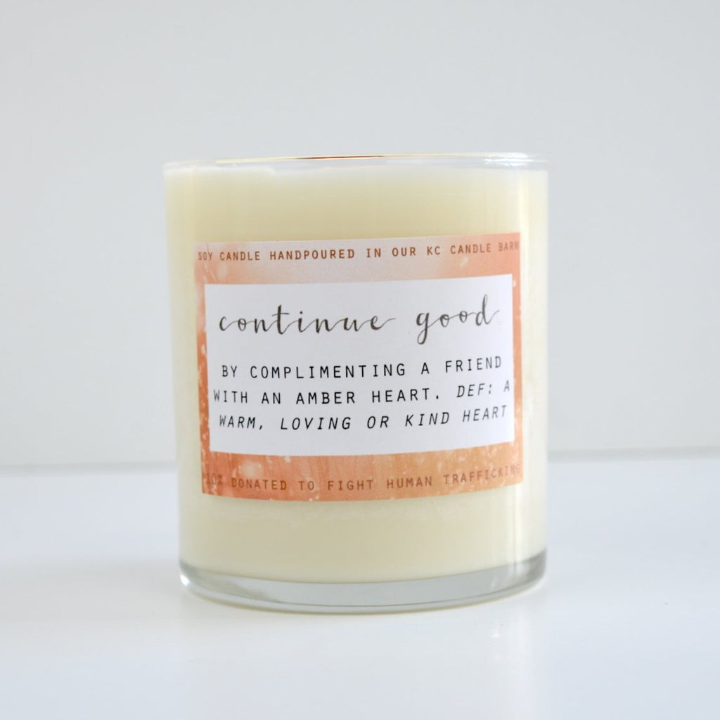 | D E T A I L S : | NOTES OF CITRUS, PLUM, AMBER, BENZOIN, JASMINE, AMYRIS, & DARK MUSK/ BACK CANDLE READS CONTINUE GOOD BY COMPLIMENTING A FRIEND WITH AN AMBER HEART; DEFINITION: A WARM, LOVING, OR KIND HEART |