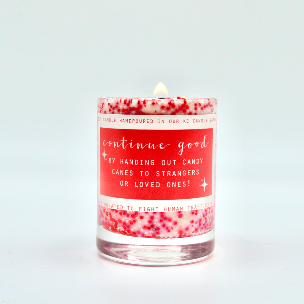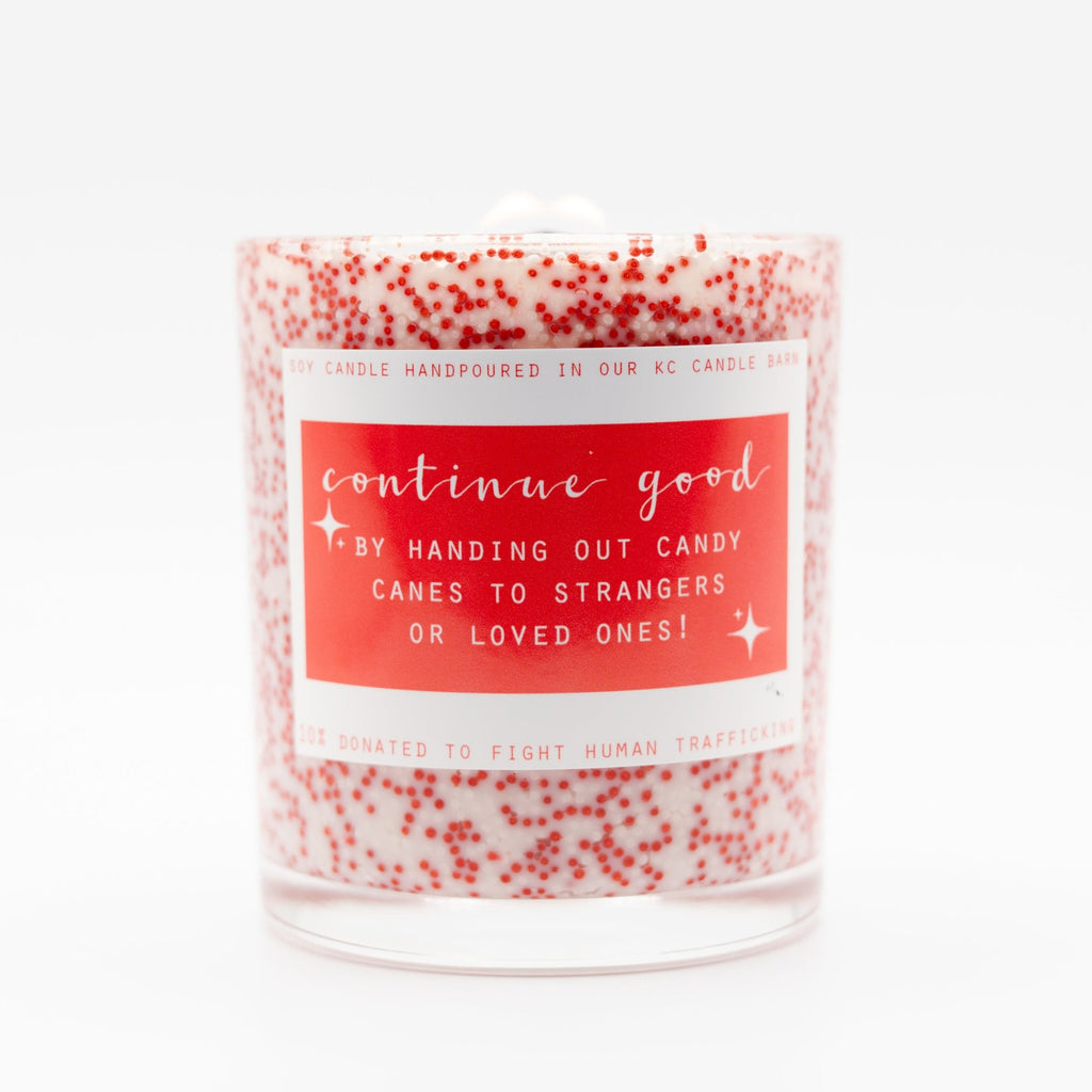 D E T A I L S : RED/WHITE SPRINKLES ATTACHED TO INSIDE OF THE JAR & CANDY CANES SPRINKLED ON TOP. SAFE TO BURN / PEPPERMINT SCENT / BACK CANDLE READS: CONTINUE GOOD BY HANDING OUT CANDY CANES TO STRANGERS OR LOVED ONES