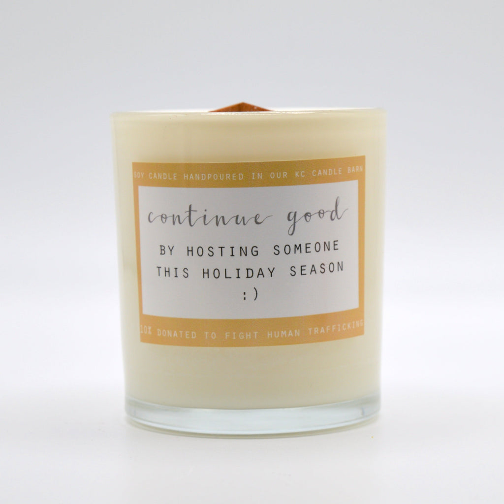 | D E T A I L S : | NOTES OF GINGERBREAD, MOLASSES, VANILLA, CLOVE, SUGAR, CHESTNUT, BUTTER, CINNAMON, & NUTMEG / BACK CANDLE READS CONTINUE GOOD BY HOSTING SOMEONE THIS HOLIDAY SEASON |